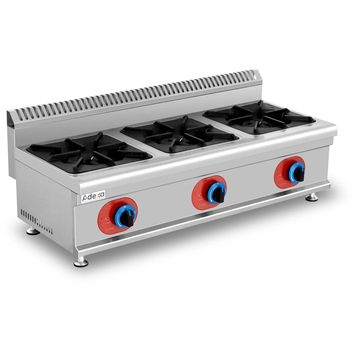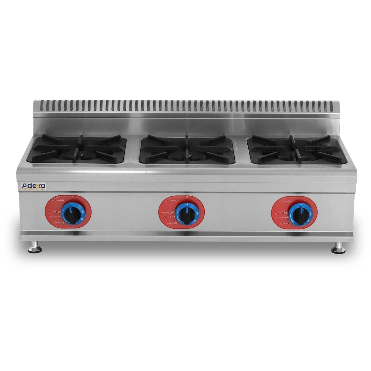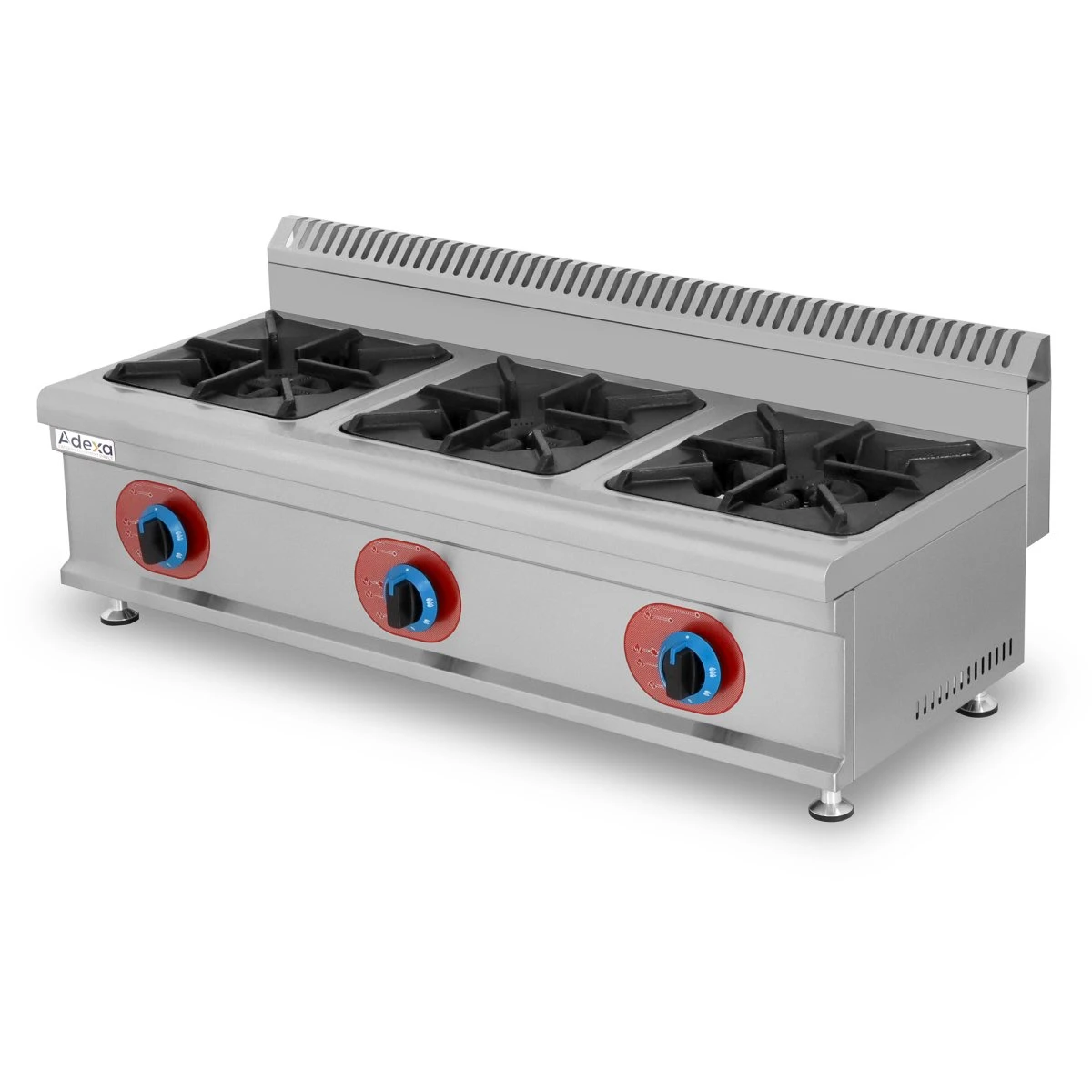 The Adexa GB3T 3 burner natural gas cooker is constructed with high quality stainless steel and features heavy duty pan supports. This sturdy and durable countertop gas cooker also features pulse ignition and flame protection for added safety. The space saving design ensures maximum countertop space with a depth of 450mm.