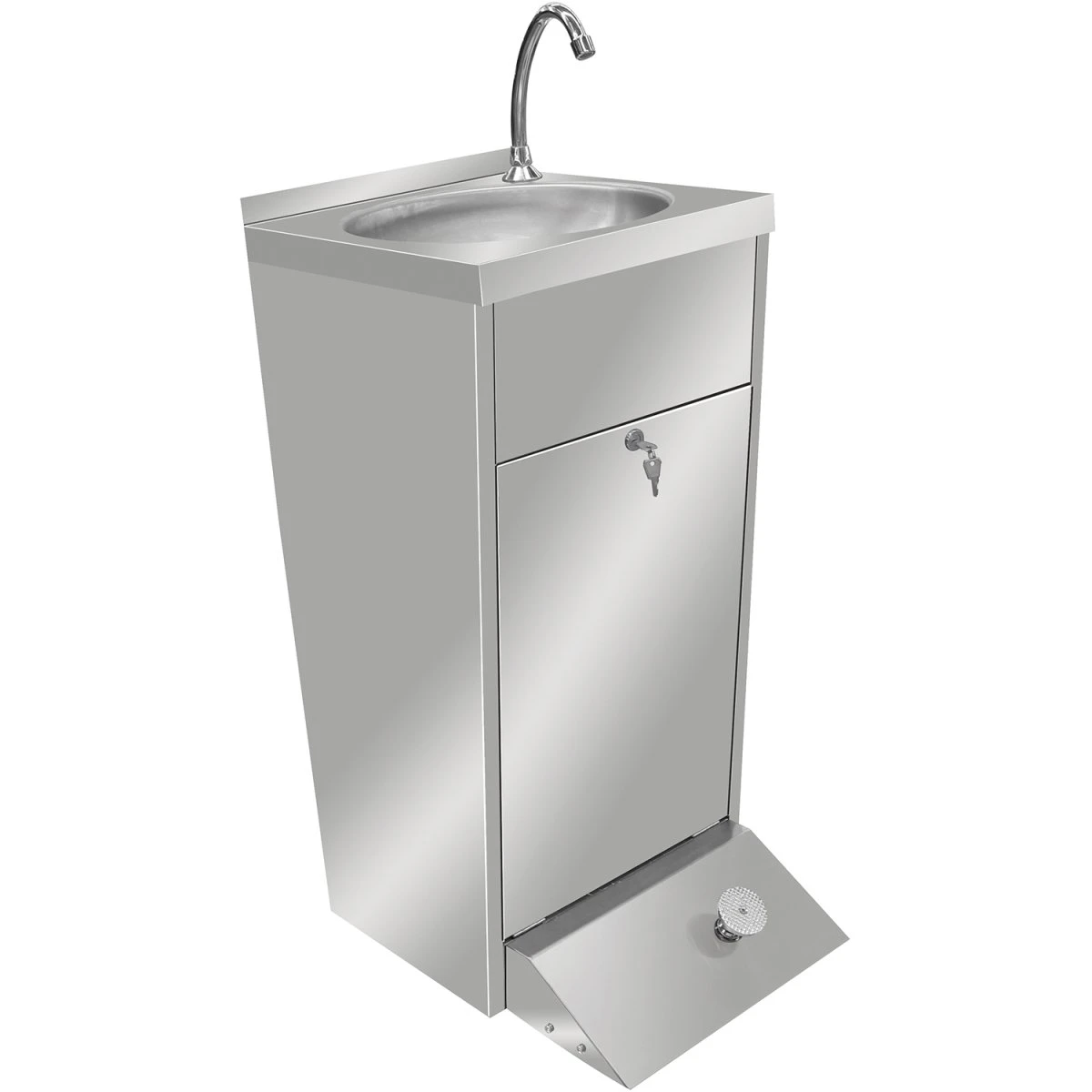 Thanks to its foot pedal operated design, this hands free professional hand sink cabinet helps reduce the risk of cross contamination in your busy commercial kitchen or industrial location.The hands free hand sink is made of durable 304 series stainless steel. A gooseneck faucet is pre-installed and it also includes a high backsplash. A must have for any catering establishment.