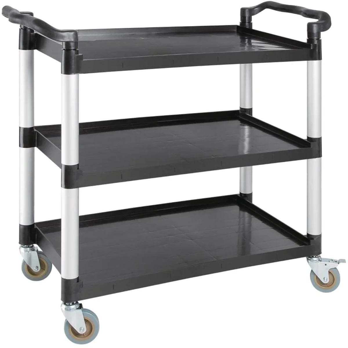 This commercial black multi-purpose utility cart combines front of the house appeal with back of the house durability. Sturdy, satin finished aluminum uprights provide exceptional support and minimize wear and tear from consistent usage. Featuring four swiver castors and brakes, this trolley can be transported with ease and safely locked in position. This versatile trolley can also be upgraded with the cutlery and refuse bin attachments (sold seperately), making this trolley practical for any restaurant, hotel or other catering establishment.